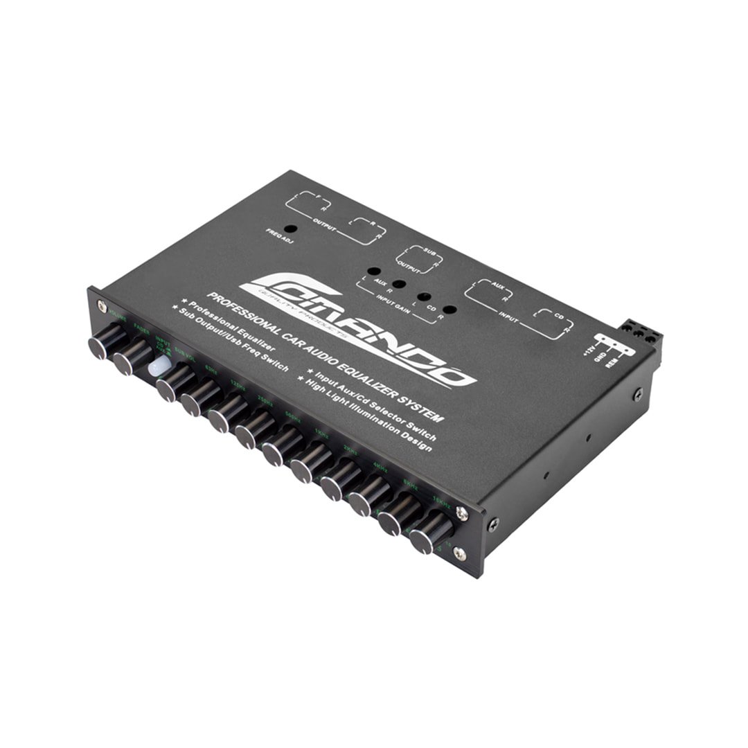 equalization 9 bands (50Hz, 125Hz, 750Hz, 2.2KHz, 6KHz and 16KHz), each frequency adjustable from -12 to +12 dB (-15 to +15 dB for subwoofer frequencies).